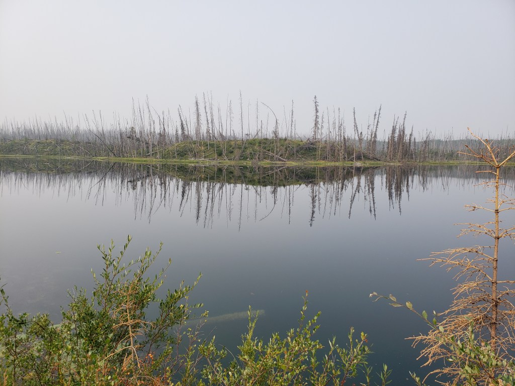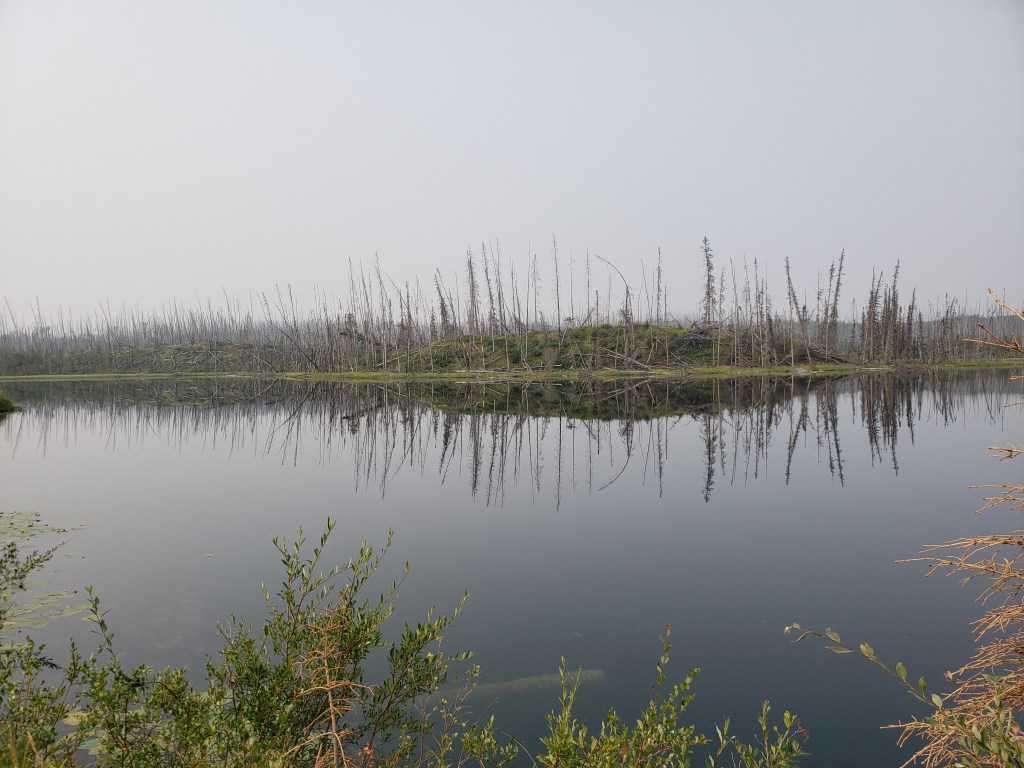 BLUE LAKE early morning. It is located in The 40 mile flats and is in the middle of an old Burn. Very still morning so they were reflected in the water.