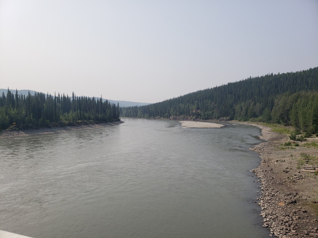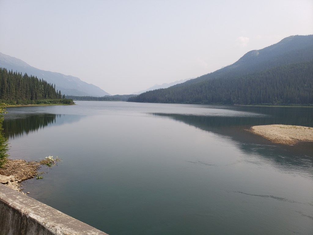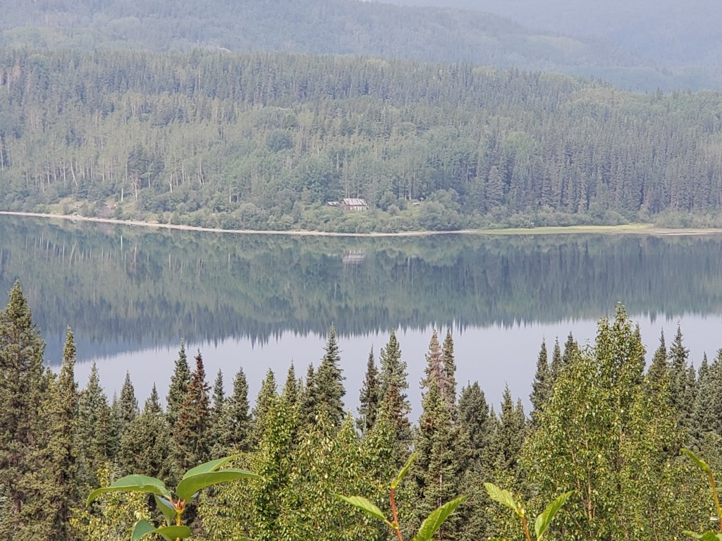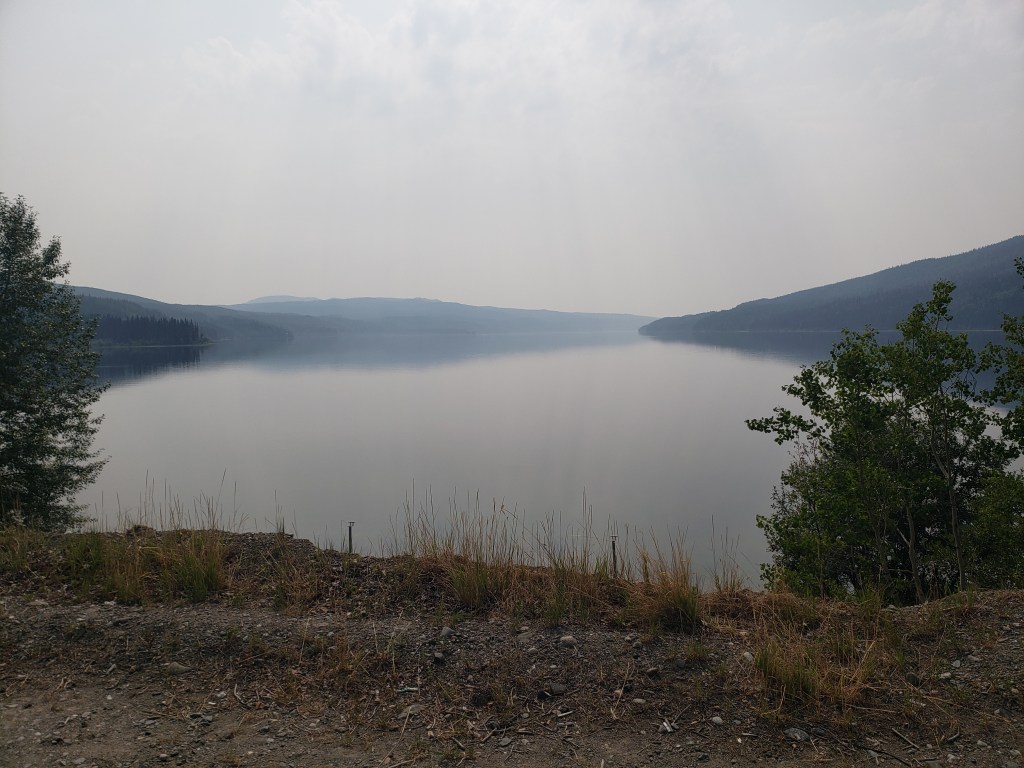 The upper end of Dease Lake. It is wide with a mountain on either side and runs for about 17 miles along the road. Still morning but Hazy.