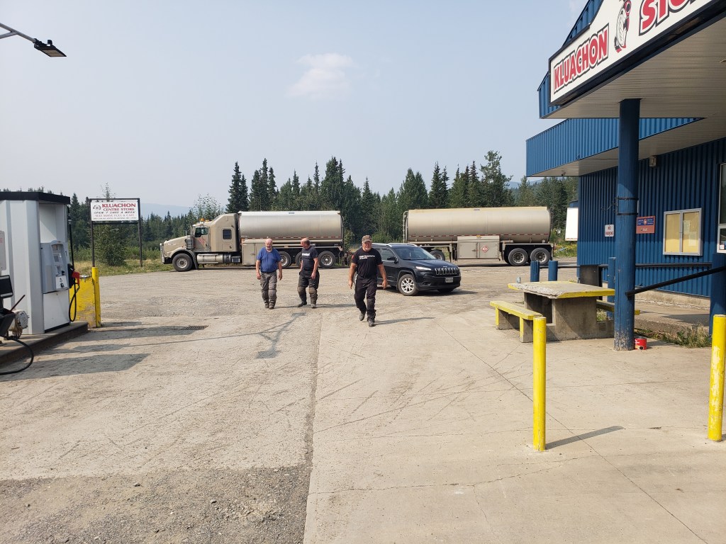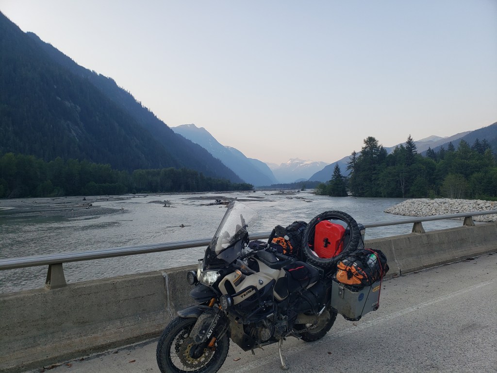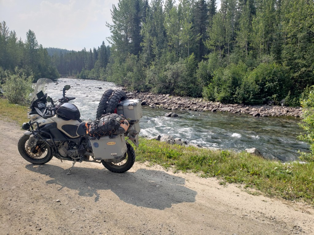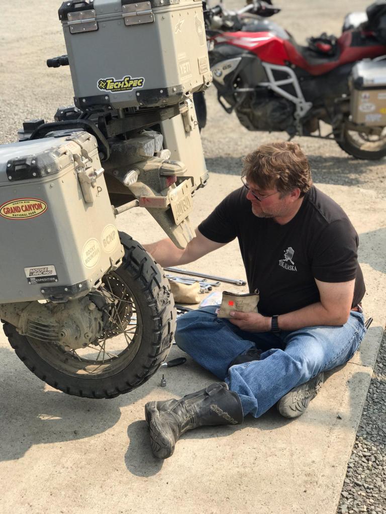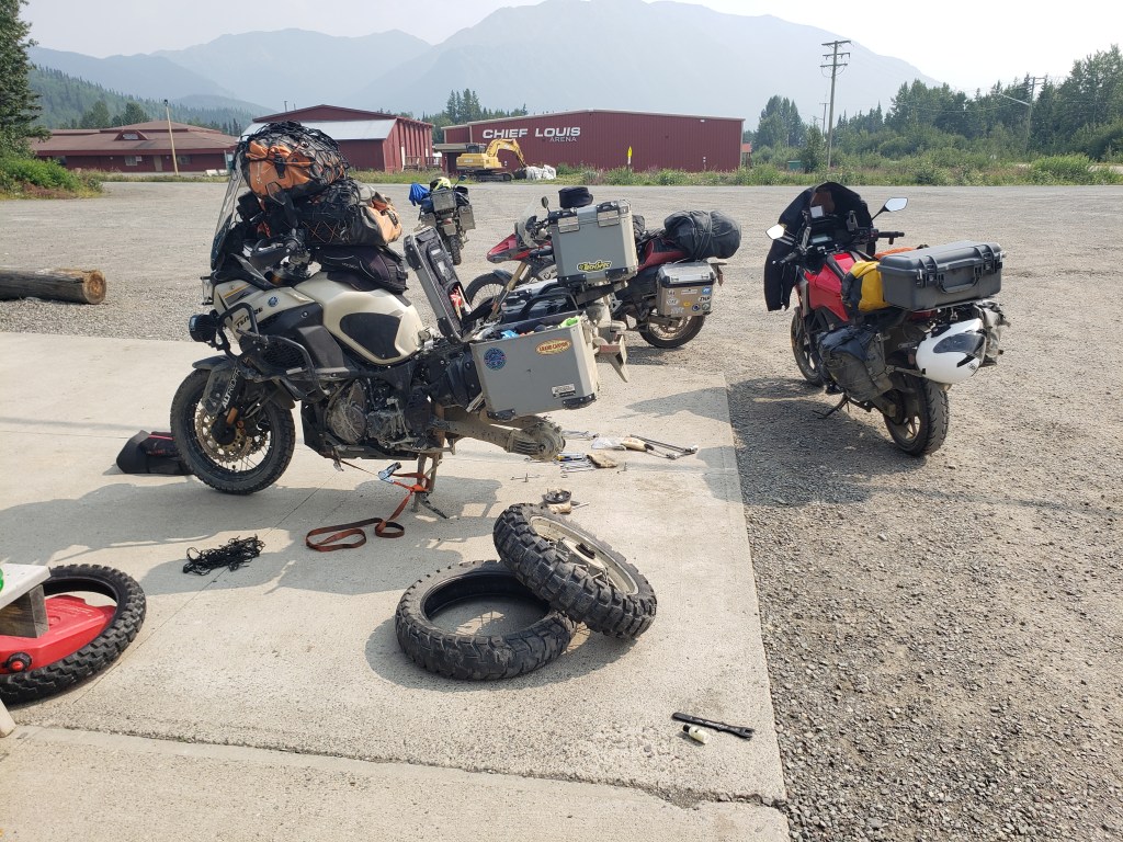 I pulled in to Iskut it’s a 2 gas pump town. Gassed up and made a comment to the guy on the other side of the pump. He was hauling motorcycles for people as he was semi-retired. He had a nice Mercedes Sprinter van and trailer. Well. We talked for quite a bit. Traded numbers. Then he had to go. But he was looking at my bike and exclaimed… Oh My Goodness. Look at your rear tire! I did and two big lugs had ripped off and the inner carcass was exposed! Those were good MotoZ Tractionator GPS tires! I was thinking that MotoZ was going to hear about this! But here we are on a Saturday afternoon (beautiful riding conditions all day) 300 miles from anywhere. The guys said… What do you want to do Guy? Try to run down the road or change it? If I had to go 10 miles down the road I would try it… but where to go as there was nothing and even if there was they would be closed. Let’s change it here. It’s on flat concrete and not on the road. Our concern was would we be able to inflate it with enough air volume to seat the bead.