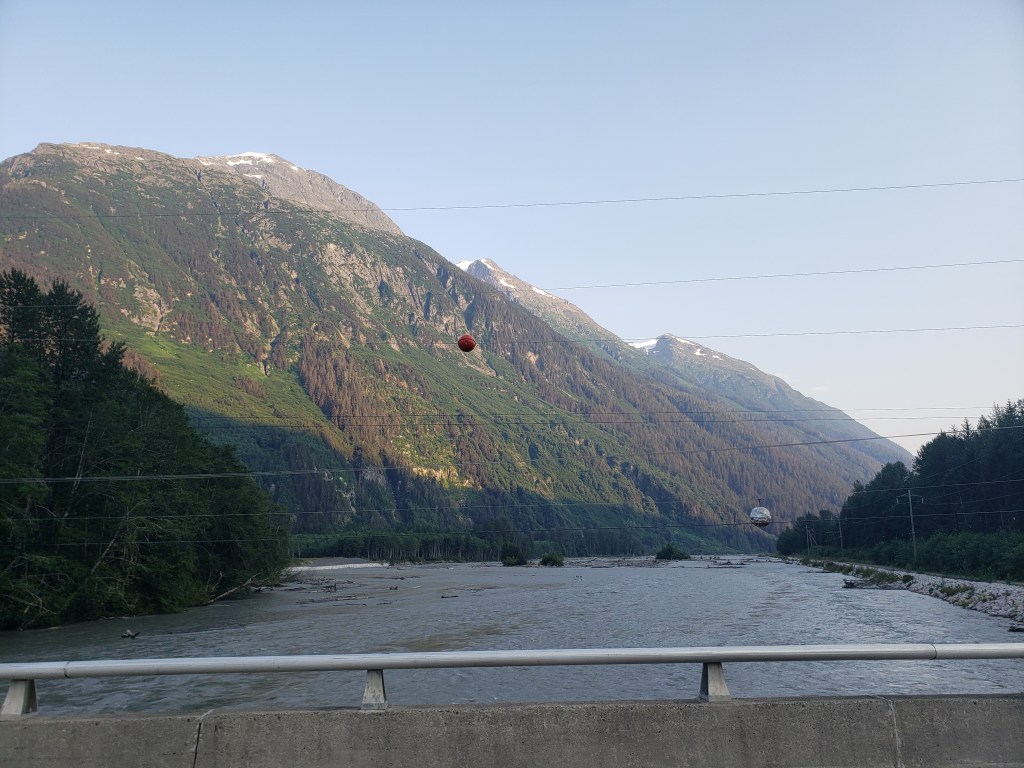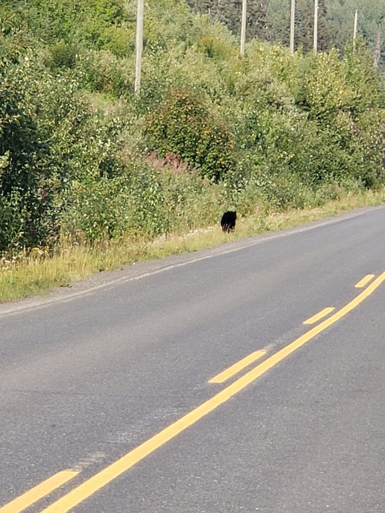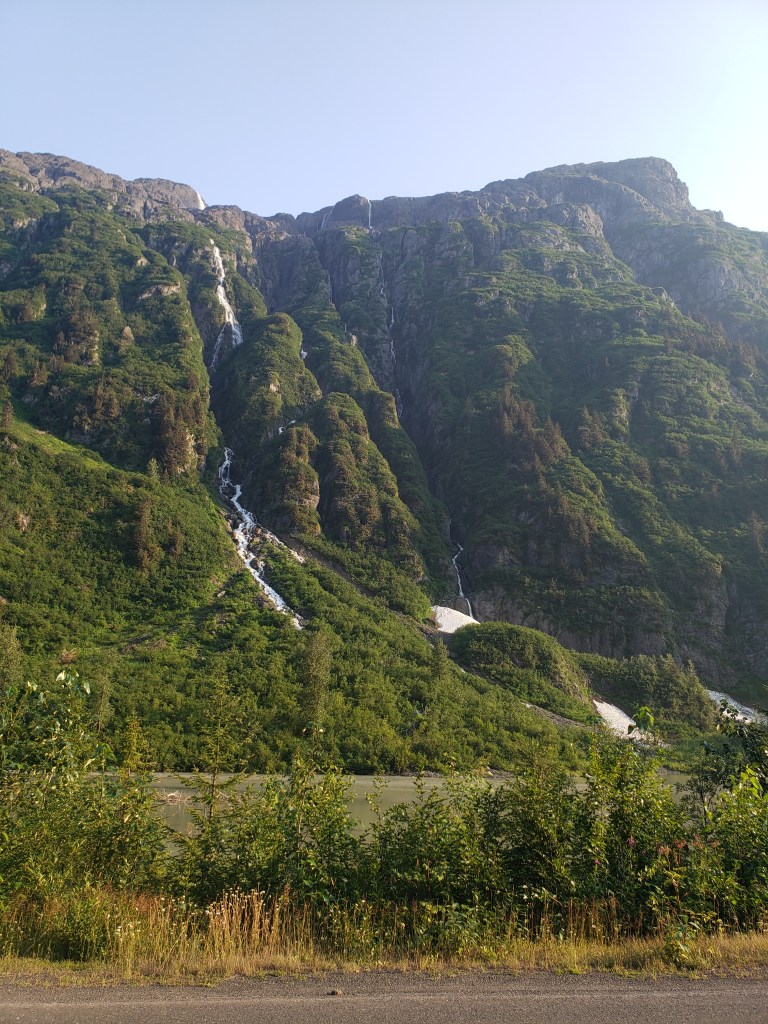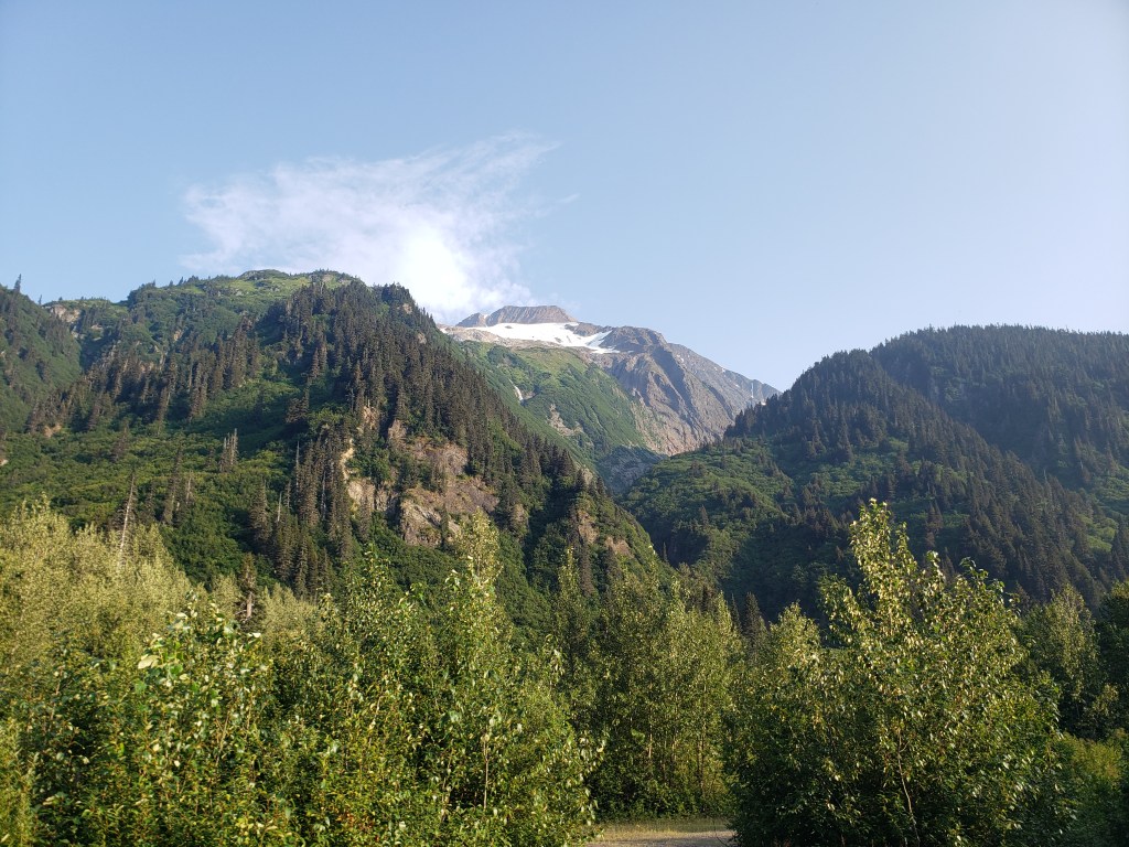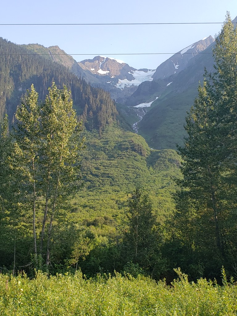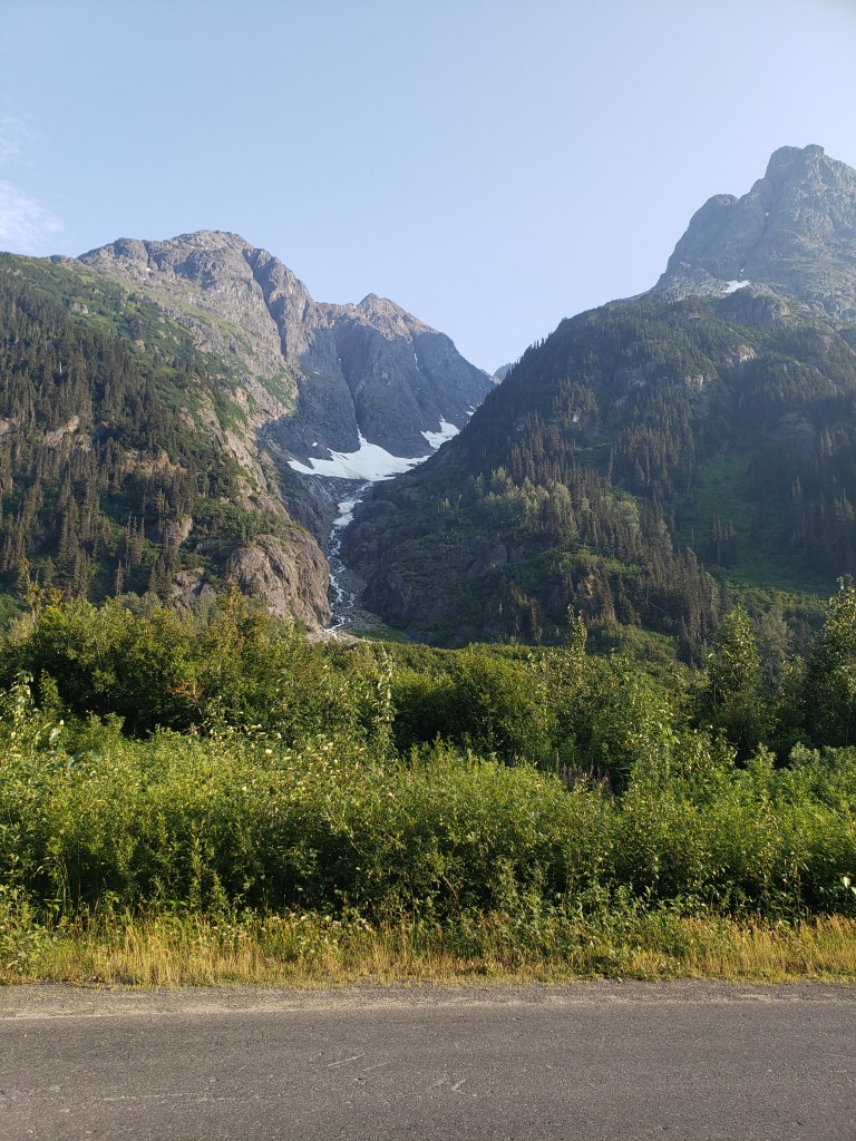 We have 192 miles to go to get to Hyder, Alaska. It is the most southern town in Alaska and can be reached by road. So off we went. I saw a black bear walking along the road but as I got close it turned and disappeared into the grass. Later when I was on the road to Stewart and Hyder I saw one walking on my side of the road so I slowed down and coasted past him while on the centerline. He/she/they ignored me so I turned around but didn’t approach it so not a good picture. Then I continued down 37A and I am so glad that we came to Hyder. 37A runs a gap between two mountains thst run for a long way. I mean you are on the road and across a small river the mountain just goes up. Green until near the top. Glaciers, snow, evening sun shining on them and waterfalls everywhere. It took me at least an hour to go 19 miles. I have pics and video. The mountains surround the town. They dominate it. It is awesome. We got out my scope as Jeff was wondering what something was on the mountain. So we zoomed up close. Yep, we told him it was a big hole in the snow where watered bored a hole through it. Had some good pizza in town and that’s the day. Very blessed with how that tire turned out and in a beautiful place for only $80 a night . So $40 each.