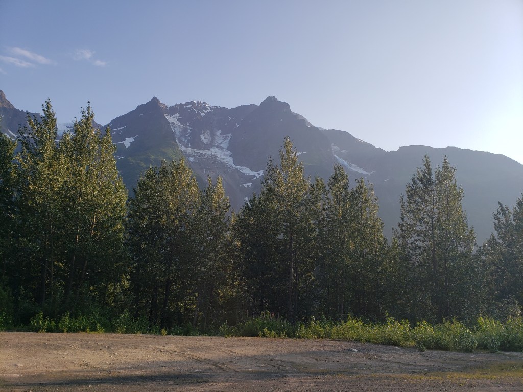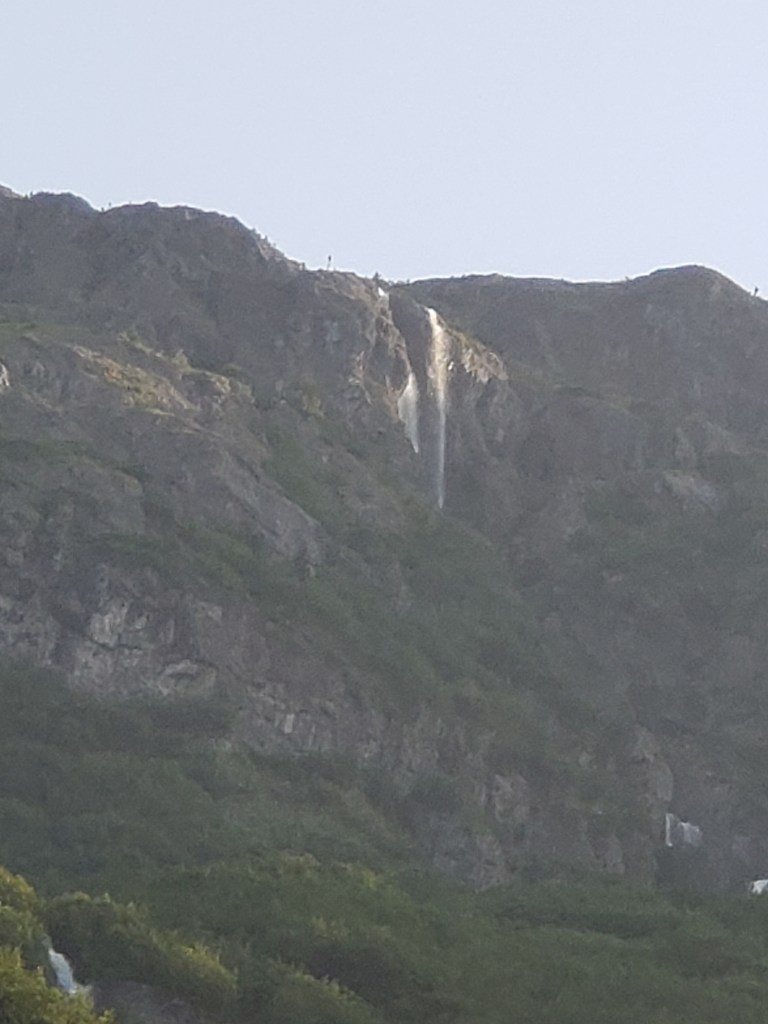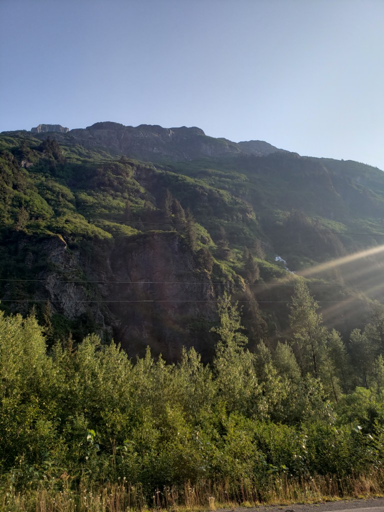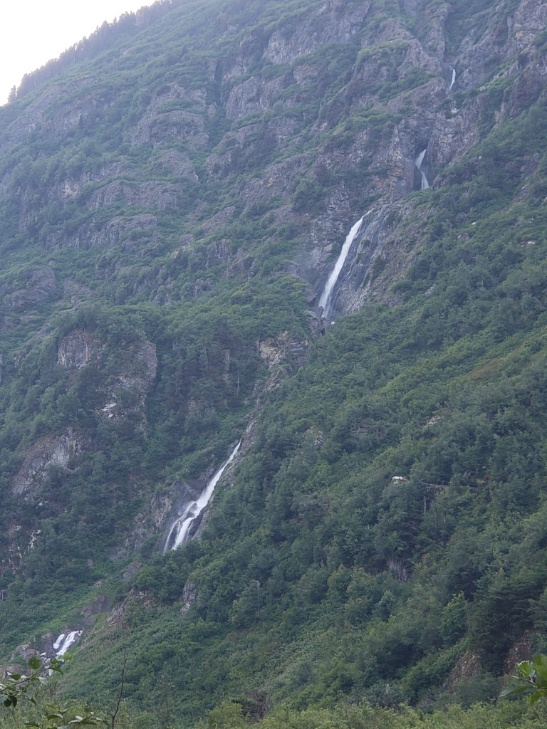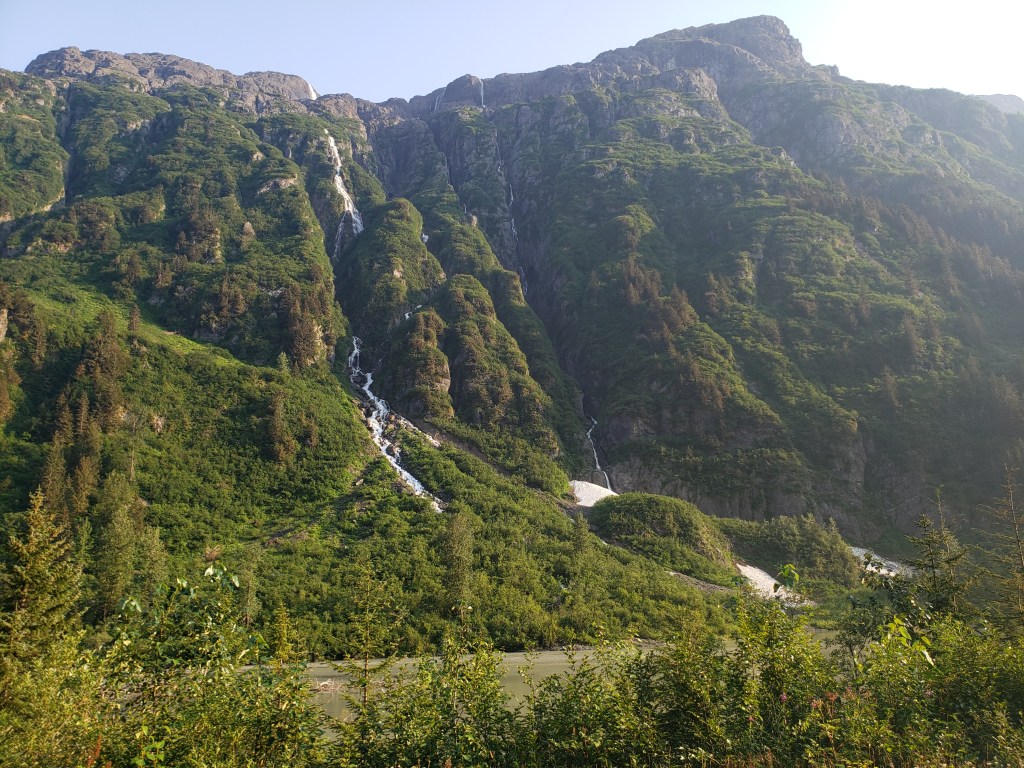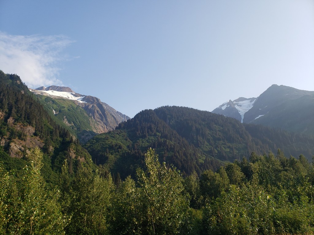 We have 192 miles to go to get to Hyder, Alaska. It is the most southern town in Alaska and can be reached by road. So off we went. I saw a black bear walking along the road but as I got close it turned and disappeared into the grass. Later when I was on the road to Stewart and Hyder I saw one walking on my side of the road so I slowed down and coasted past him while on the centerline. He/she/they ignored me so I turned around but didn’t approach it so not a good picture. Then I continued down 37A and I am so glad that we came to Hyder. 37A runs a gap between two mountains thst run for a long way. I mean you are on the road and across a small river the mountain just goes up. Green until near the top. Glaciers, snow, evening sun shining on them and waterfalls everywhere. It took me at least an hour to go 19 miles. I have pics and video. The mountains surround the town. They dominate it. It is awesome. We got out my scope as Jeff was wondering what something was on the mountain. So we zoomed up close. Yep, we told him it was a big hole in the snow where watered bored a hole through it. Had some good pizza in town and that’s the day. Very blessed with how that tire turned out and in a beautiful place for only $80 a night . So $40 each.