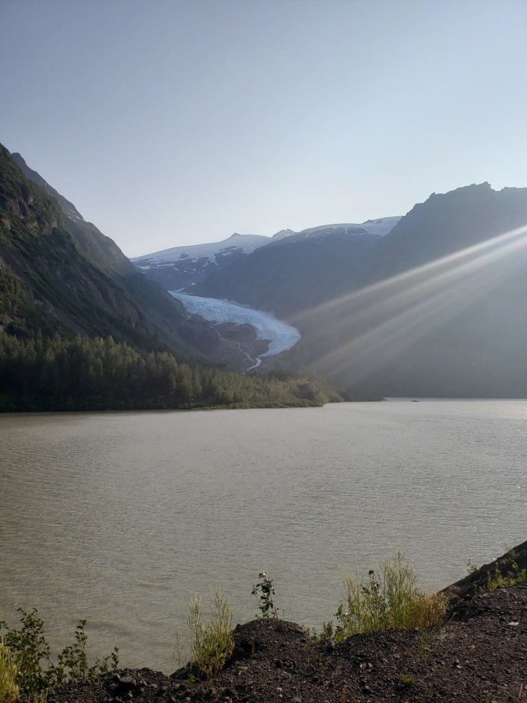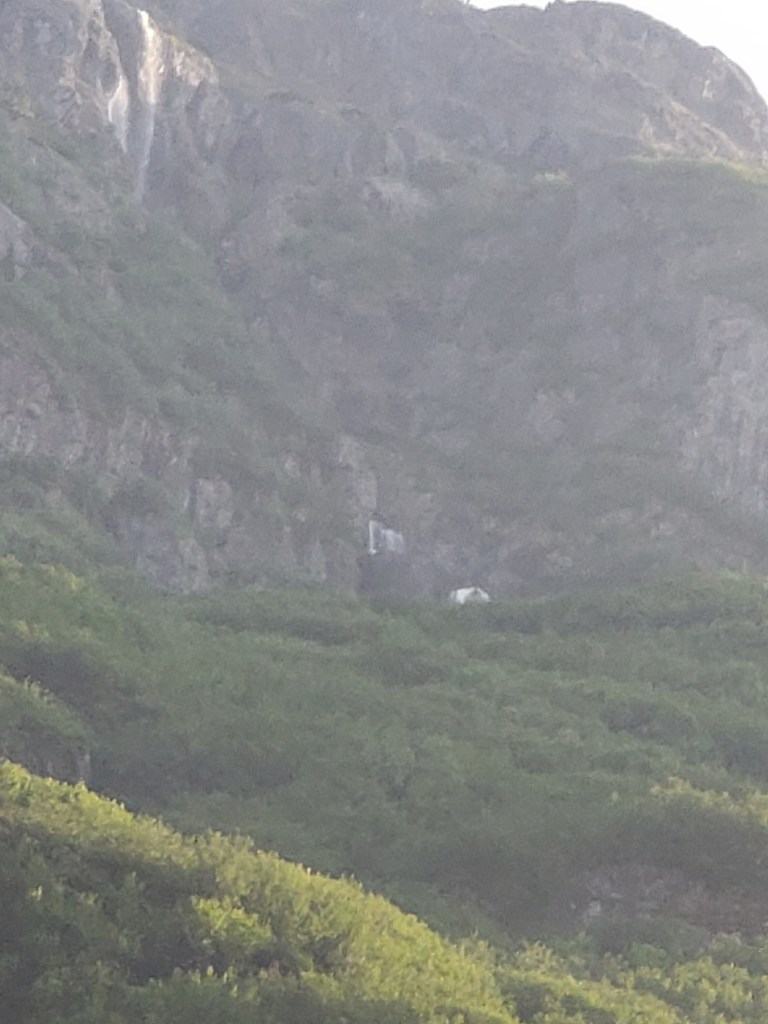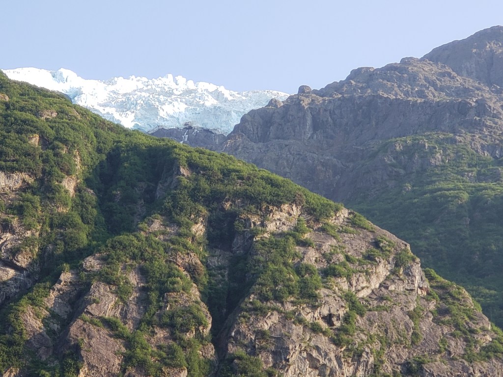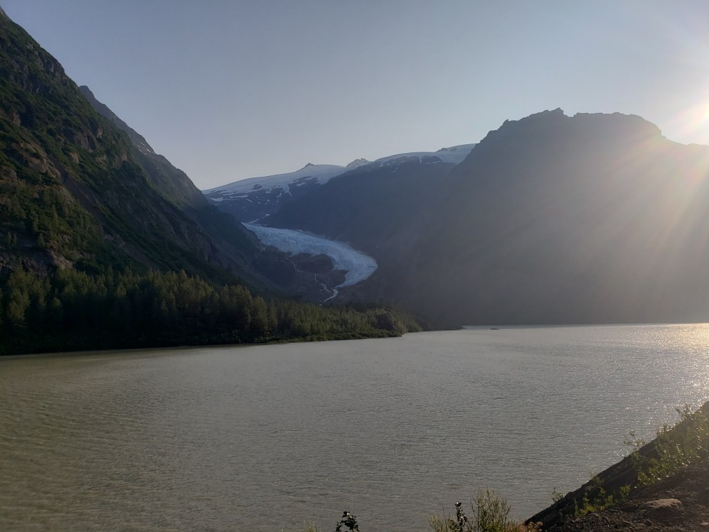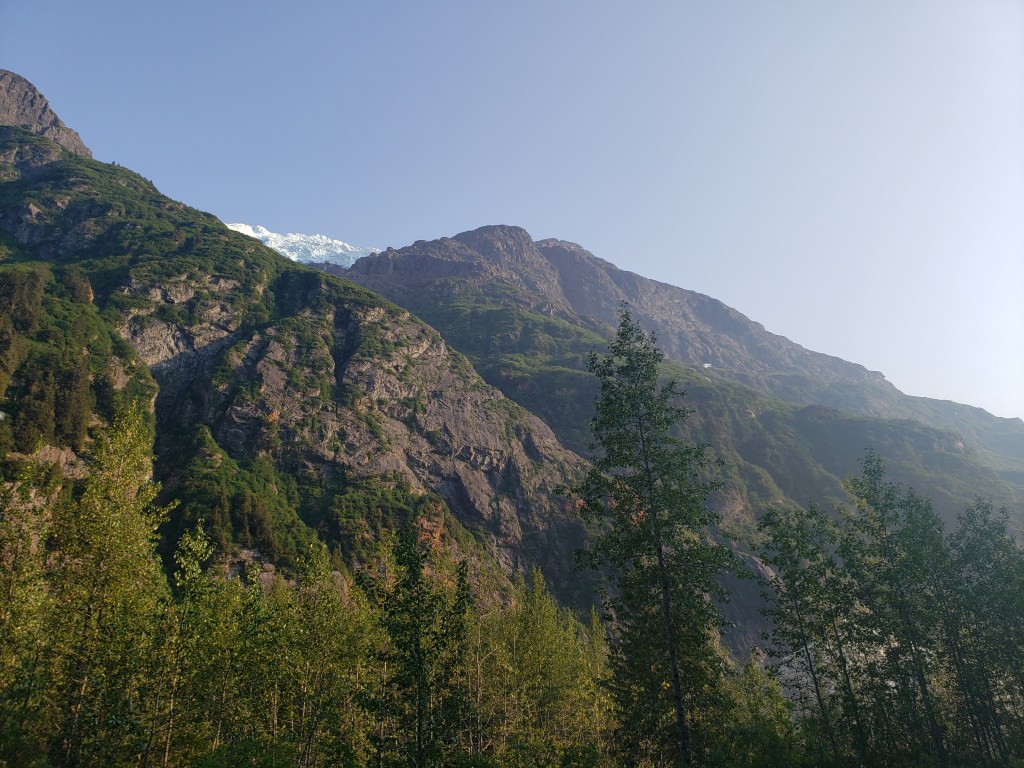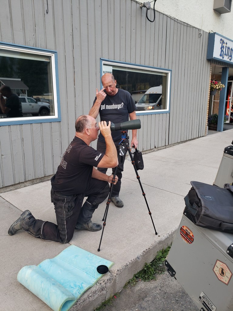 We have 192 miles to go to get to Hyder, Alaska. It is the most southern town in Alaska and can be reached by road. So off we went. I saw a black bear walking along the road but as I got close it turned and disappeared into the grass. Later when I was on the road to Stewart and Hyder I saw one walking on my side of the road so I slowed down and coasted past him while on the centerline. He/she/they ignored me so I turned around but didn’t approach it so not a good picture. Then I continued down 37A and I am so glad that we came to Hyder. 37A runs a gap between two mountains thst run for a long way. I mean you are on the road and across a small river the mountain just goes up. Green until near the top. Glaciers, snow, evening sun shining on them and waterfalls everywhere. It took me at least an hour to go 19 miles. I have pics and video. The mountains surround the town. They dominate it. It is awesome. We got out my scope as Jeff was wondering what something was on the mountain. So we zoomed up close. Yep, we told him it was a big hole in the snow where watered bored a hole through it. Had some good pizza in town and that’s the day. Very blessed with how that tire turned out and in a beautiful place for only $80 a night . So $40 each.