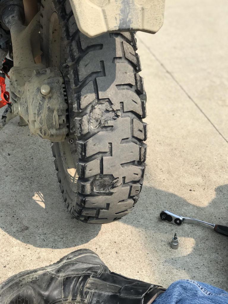 The cause had nothin to do with anything MotoZ did. It was all my fault. I had a very heavy load and all week I was thinking that I should pump up my tires to max cold inflation pressure. I didn’t as a little lower pressure is good on gravel… but with the load I had and they were low on pavement and gravel for 6,500 miles that tread had been flexing like it wasn’t designed to flex. After examining the old tire there were a lot more lugs cracking at the base. Lesson learned… just do what I think I should do and not rationalize it away. I pump up my tire pressure on my cars and truck when I haul heavy… should have on my bike too.