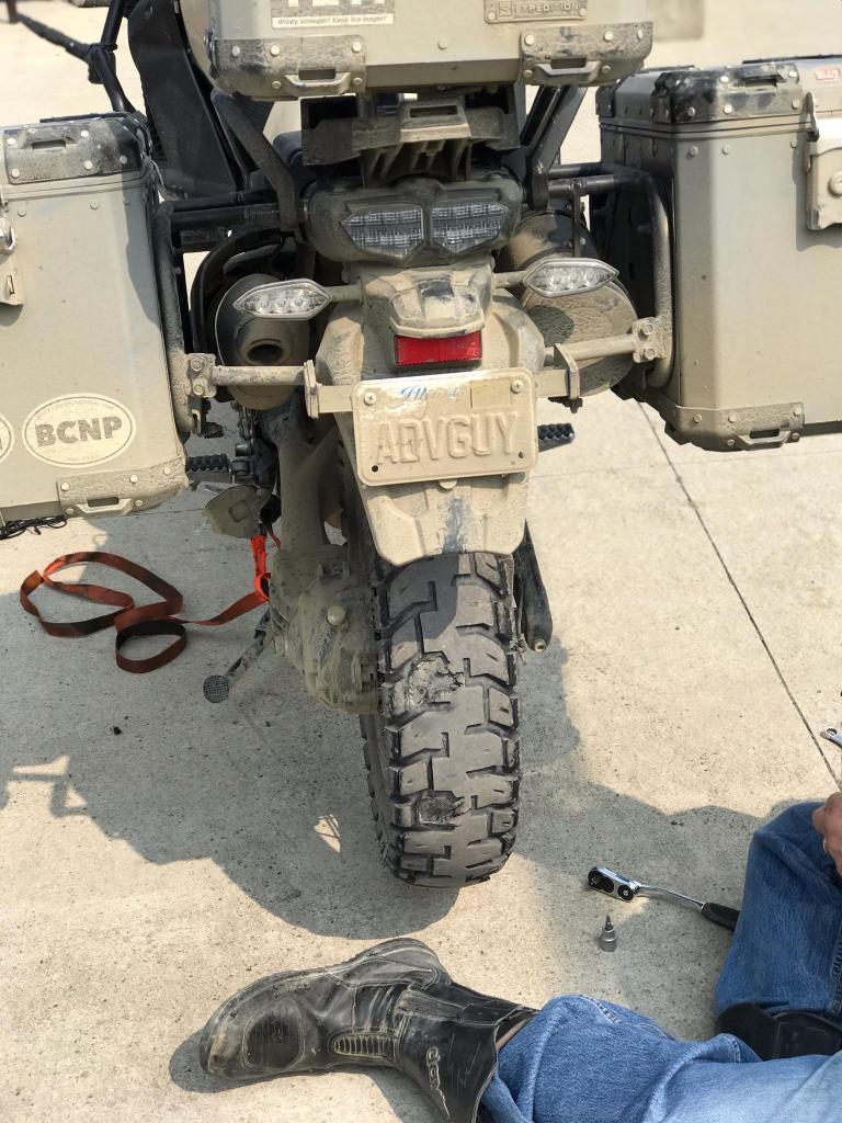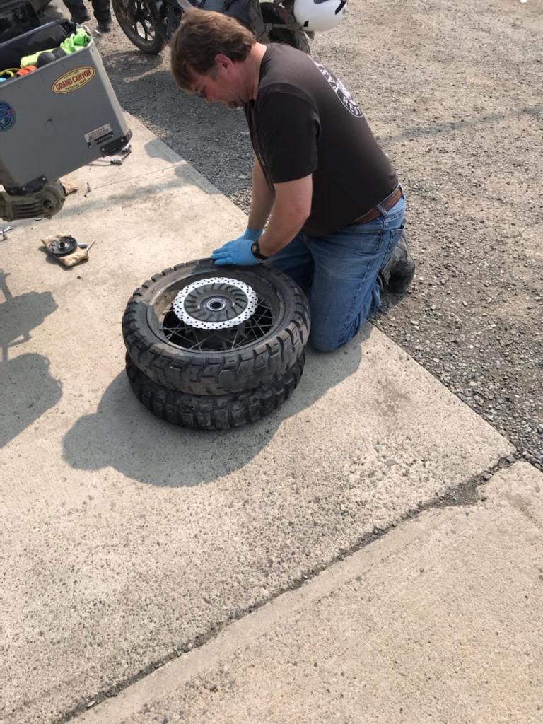 I was going to go in and get some liquid soap from the store. Mike asks… don’t you have any shampoo? Yes, I do! Jeff said he had some conditioner he got from the hotel. I used it to lube the new tire to help it slip over the rim. Worked as I popped the first side on without tire irons. The next side was harder as it always is but we had it done in less than 5 minutes.
