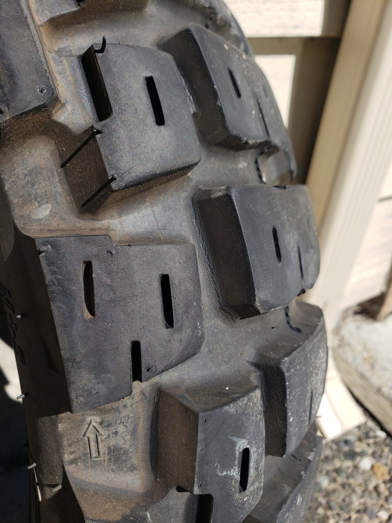 Got home and put the new tireand rim on. Put my removed tire on the back seat for a spare. All good. Turned the bike around and removed the fork protectors and pried the dust seals down and cleaned the seals/forks with a rag then got out the tool to actually get up inside my seals and remove possible crud that is letting it leak. Got some out on both sides. All back together and I will be looking closely for leakage in the next few riding days. If no leakage then I’ll remove the calipers and clean them and the rotors and install new pads… which I have in my pannier.