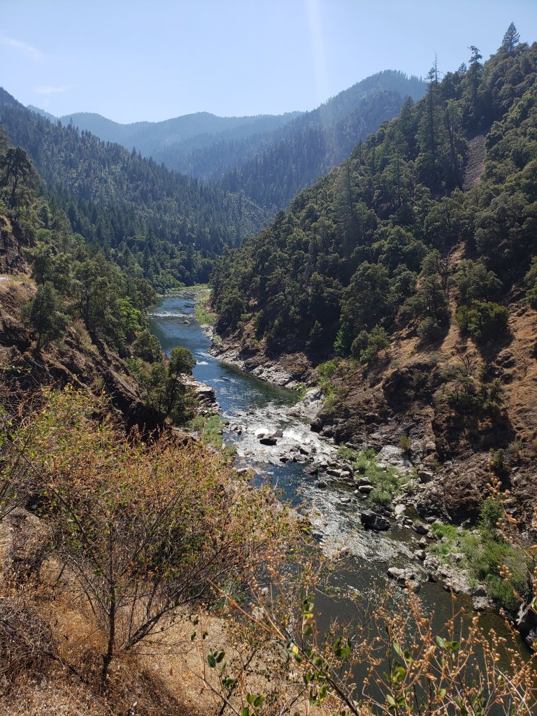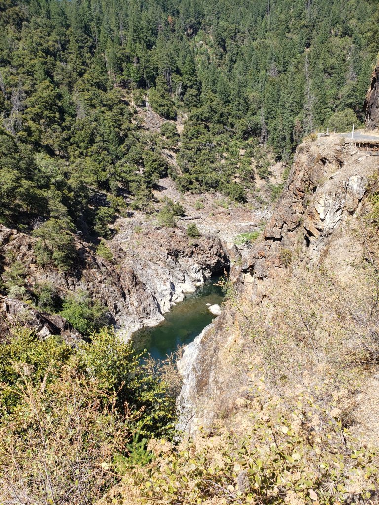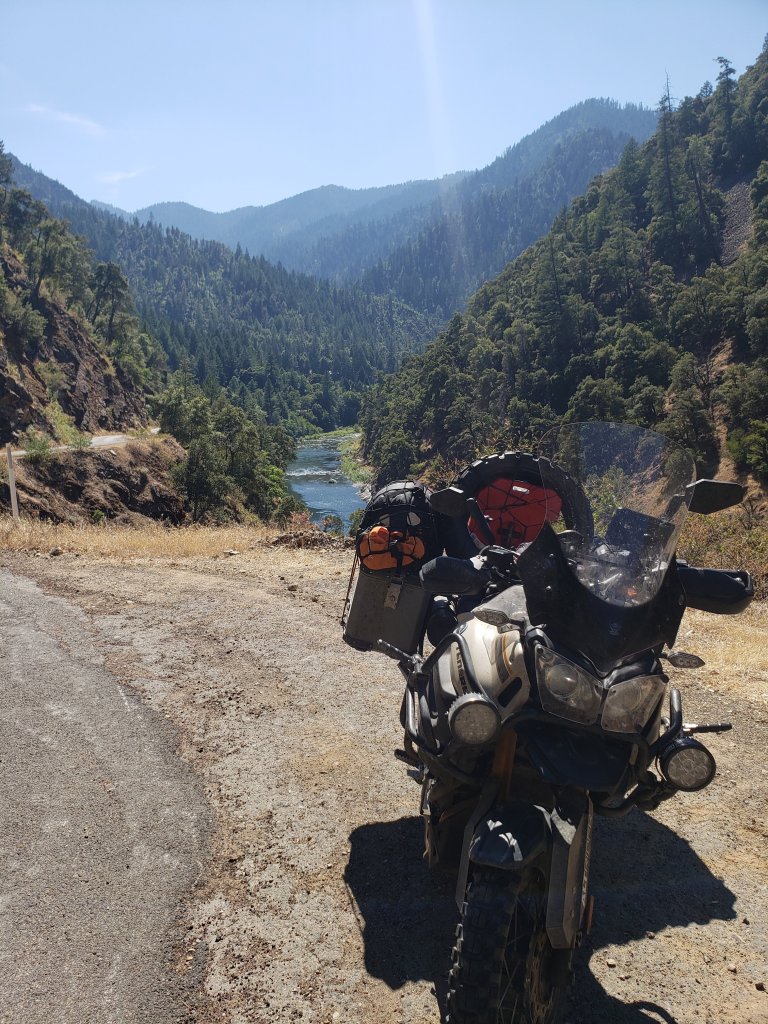 My MotoZ Tractionator tires continue to amaze me as I have the very dirt oriented one on up front and it did a wonderful job all day and so did the 50/50 tire on the rear. In the corners I was using all the tire all the way to the edge except for maybe an 1/8”. The bike did fantastic too. Fully loaded and it still was very responsive handling and cornering well. It could have used a bit more power for regaining speed coming out of a corner and while climbing up the pass but to be perfectly honest I was flogging it pretty hard so no complaints. Most of the riding was under trees until I got to a sign that said… one lane road starts ahead. Soon I was on a one lane road that was on a cliff or cut out of a cliff face… as in, you go off the pavement you fall 300 or more feet into a river with rapids and on my right the mountaincontinuedto go up. Calling it one lane was being generous. The guys who paved it had to be very brave! I was going 25 to 35 mph and that’s it. The river gorge was beautiful. I had left the coast behind and it was now 100 to 104°F. The video should prove interesting. I’m going forward but there were plenty of blind corners and I came up to one hugging the inside and a small car pops aroundthe corner less than 10 feet away and I instinctively react and squeeze closer to the rock wall to my right. He goes a little towards the edge and he gets by. If I had been a car it would have been a collision and he most likely could have gone over the edge. This road went on for miles. I was getting used to having space on my left and going a bit faster but not much faster. Just more comfortable with it. It finally became two lane again at Cecilville. I had a half tank of gas left plus my spare two gallons but I saw a gas pump and pulled in. I could use a break anyway. I hadn’t eaten anything since breakfast and it was around 3 pm.