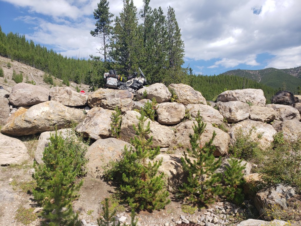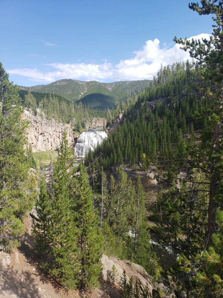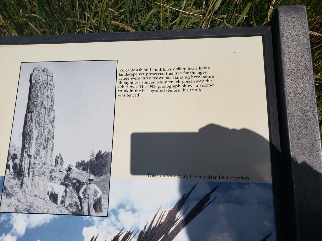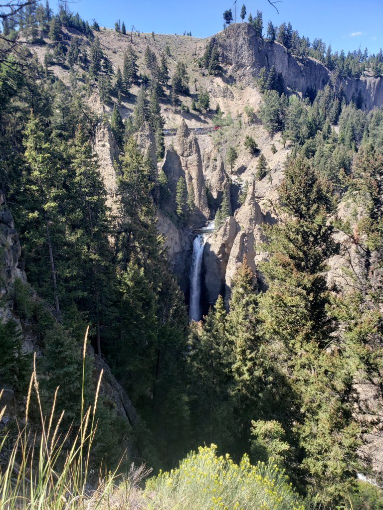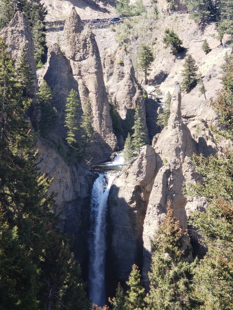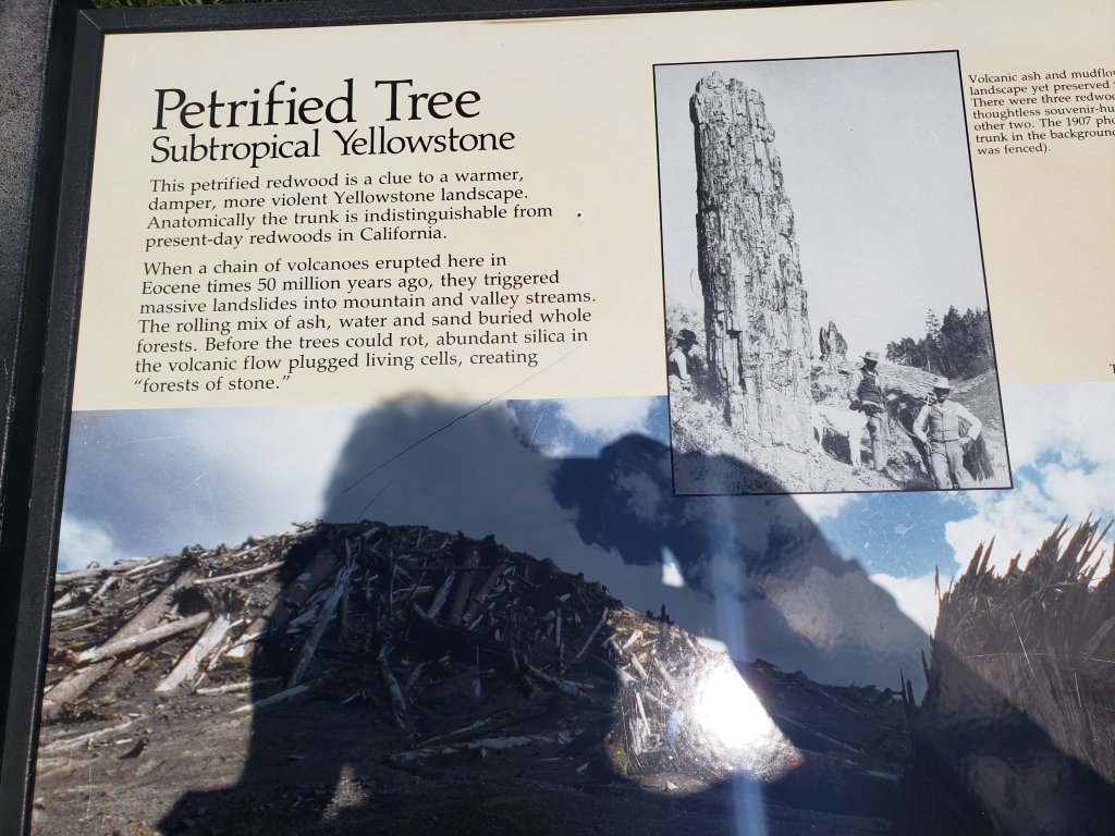 Temps were in the 50’s this morning so I wasn’t in a hurry to leave. On the road at 9 am and it was 63° sunny and somewhat calm… for Idaho! Ran up to West Yellowstone. Traffic wasn’t to bad and there always seemed to be a passing zone when I needed one. Pretty country as you get north of Island Park. Traffic in Yellowstone is always busy during the summer months. I just pulled off and let the long lines go by then I went 5 or 8 mph under the 45 mph limit. Then if someone came up behind me I would wave them by as I moved to the far right side of the road. Stopped at Gibbons Falls. Quite pretty. I also stopped at Tower Falls and I purchased a sticker there. My goal was to get to the petrified tree. They say it was a redwood tree. There were 3 trunks originally but prior to 1912 souvenir hunters chipped two of them away. Now there is a fence around the remaining one. You can see bark still on the tree.
