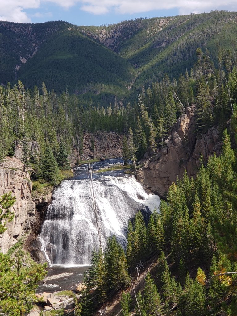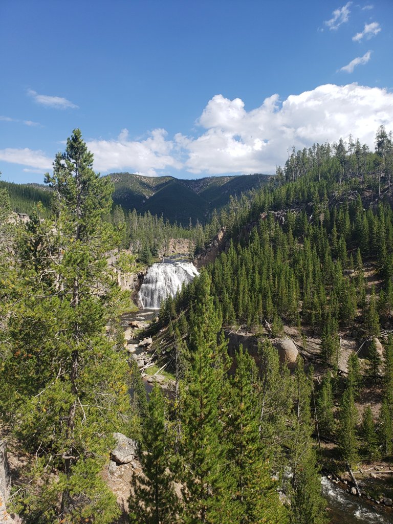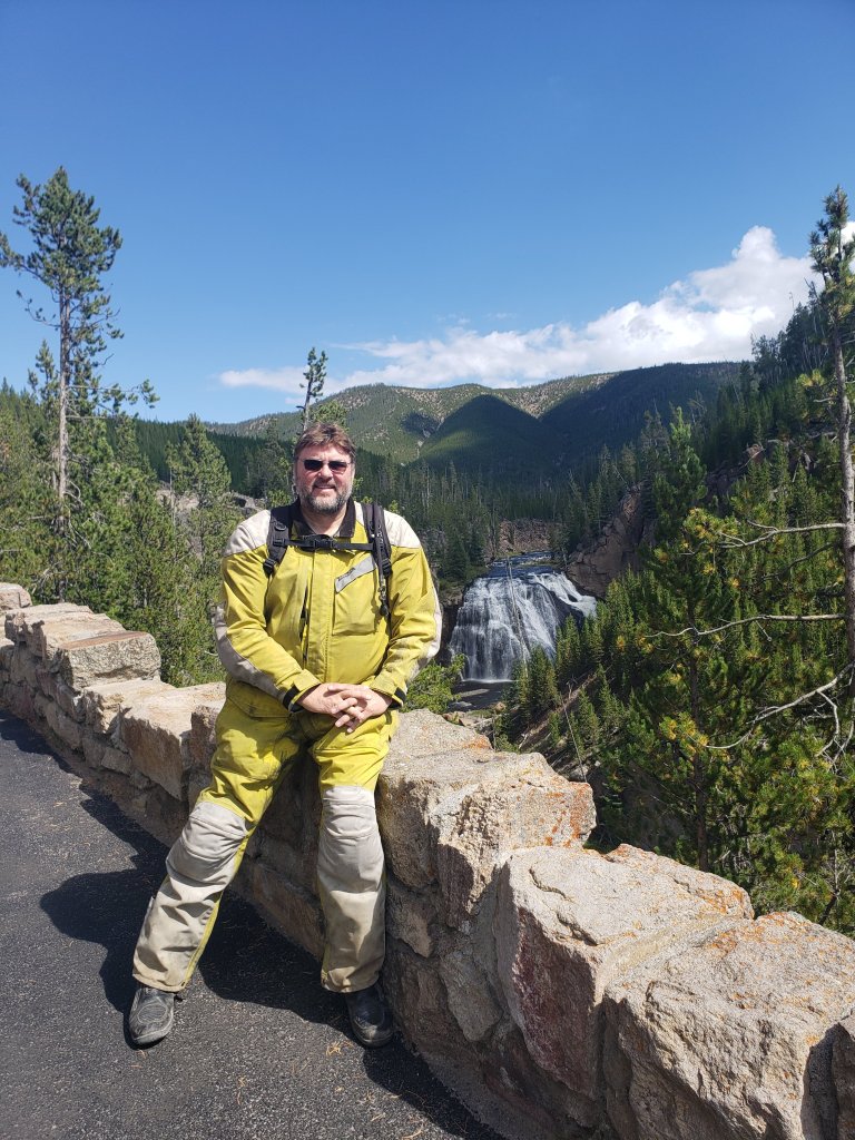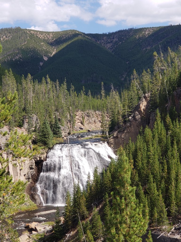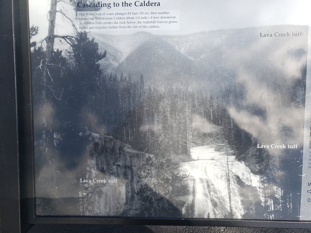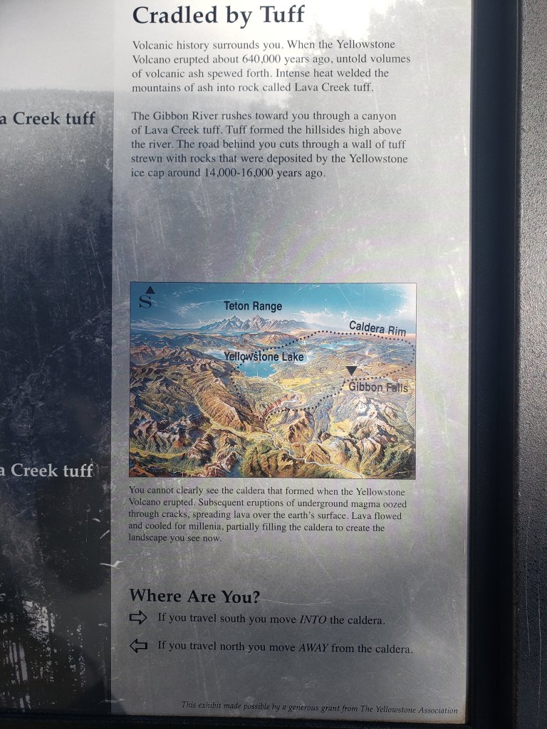 Temps were in the 50’s this morning so I wasn’t in a hurry to leave. On the road at 9 am and it was 63° sunny and somewhat calm… for Idaho! Ran up to West Yellowstone. Traffic wasn’t to bad and there always seemed to be a passing zone when I needed one. Pretty country as you get north of Island Park. Traffic in Yellowstone is always busy during the summer months. I just pulled off and let the long lines go by then I went 5 or 8 mph under the 45 mph limit. Then if someone came up behind me I would wave them by as I moved to the far right side of the road. Stopped at Gibbons Falls. Quite pretty. I also stopped at Tower Falls and I purchased a sticker there. My goal was to get to the petrified tree. They say it was a redwood tree. There were 3 trunks originally but prior to 1912 souvenir hunters chipped two of them away. Now there is a fence around the remaining one. You can see bark still on the tree.