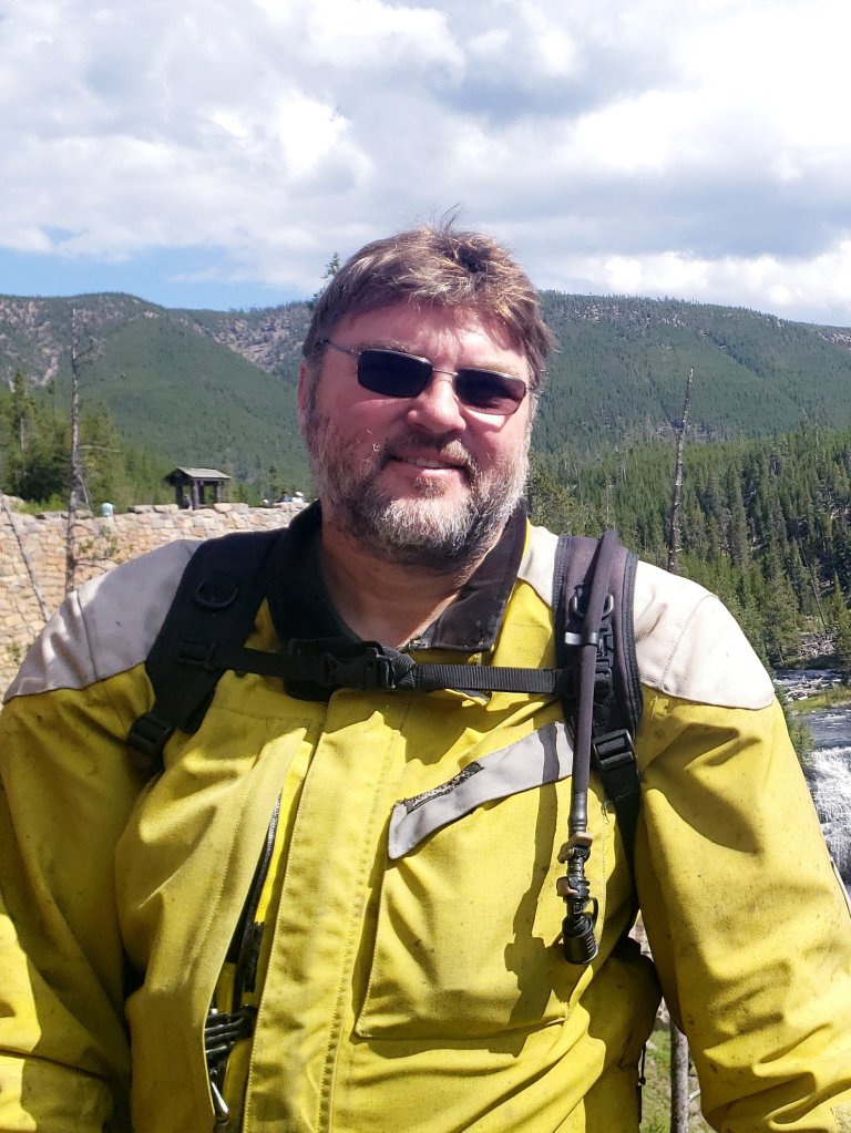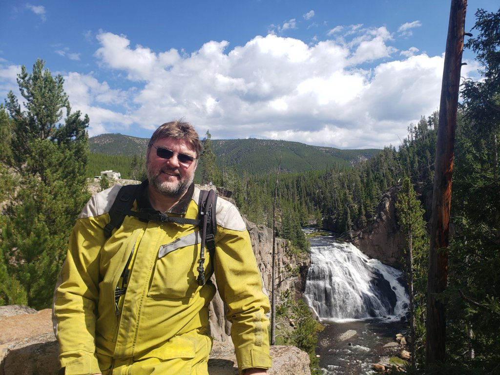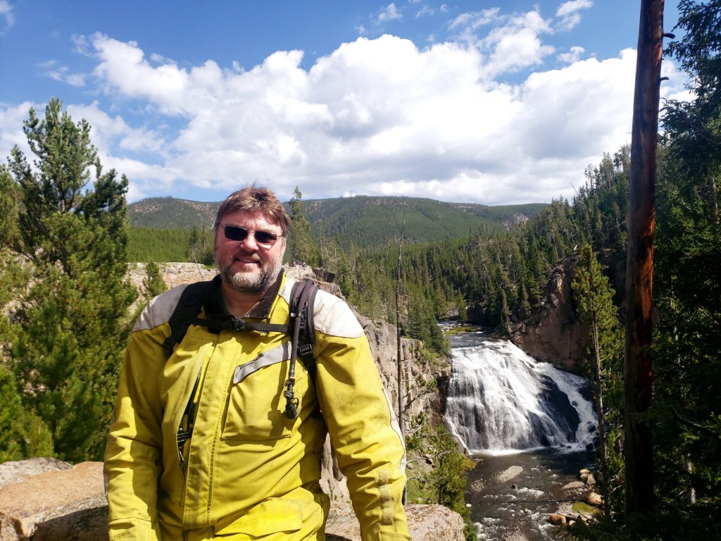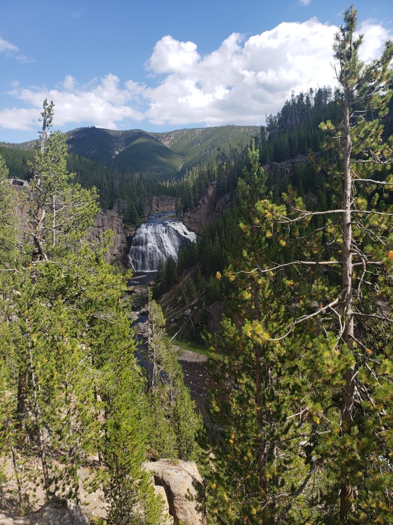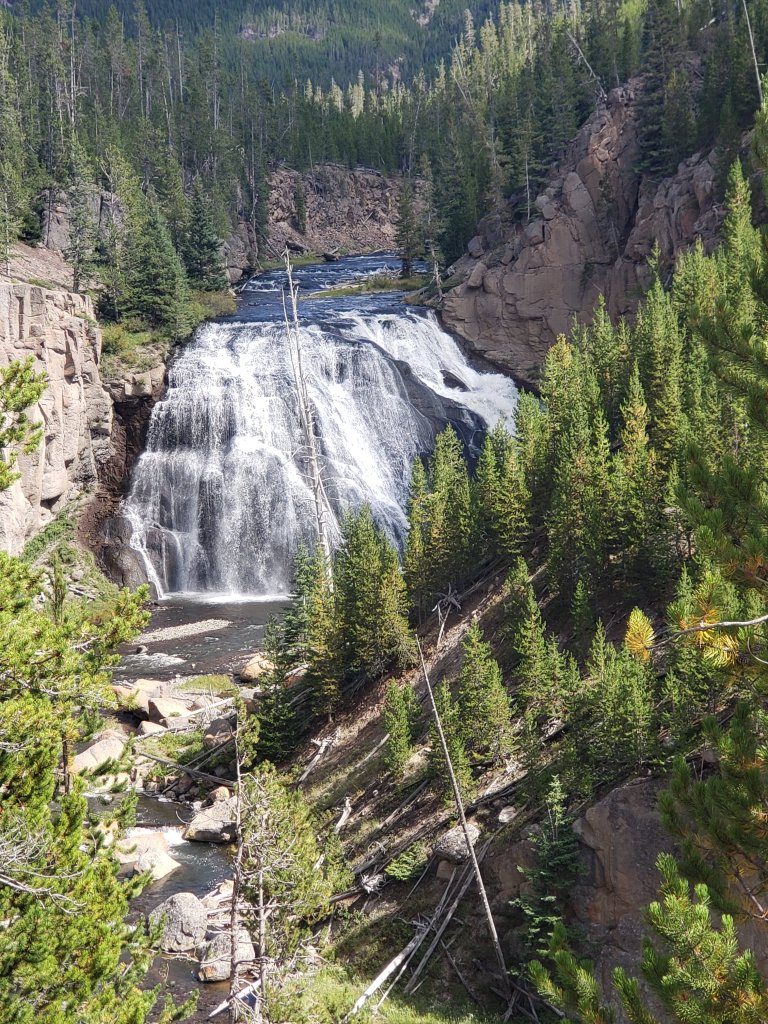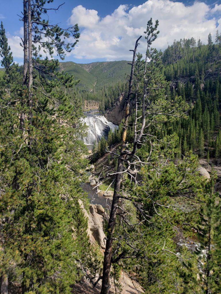 Temps were in the 50’s this morning so I wasn’t in a hurry to leave. On the road at 9 am and it was 63° sunny and somewhat calm… for Idaho! Ran up to West Yellowstone. Traffic wasn’t to bad and there always seemed to be a passing zone when I needed one. Pretty country as you get north of Island Park. Traffic in Yellowstone is always busy during the summer months. I just pulled off and let the long lines go by then I went 5 or 8 mph under the 45 mph limit. Then if someone came up behind me I would wave them by as I moved to the far right side of the road. Stopped at Gibbons Falls. Quite pretty. I also stopped at Tower Falls and I purchased a sticker there. My goal was to get to the petrified tree. They say it was a redwood tree. There were 3 trunks originally but prior to 1912 souvenir hunters chipped two of them away. Now there is a fence around the remaining one. You can see bark still on the tree.