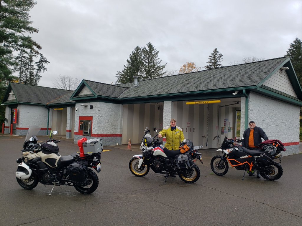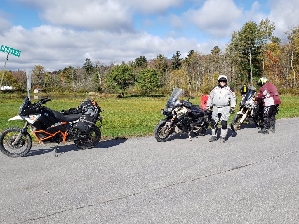 We were up and packing the bikes for the day and it was still very dark due to heavy low clouds at 7 am. Temperature was in the low 40’s. After all the rain yesterday, it wasn’t just Jared’s bike that was dirty as all the bikes were trashed and anywhere you touched them you would pick up gritty sand/mud. Mike headed for a carwash, and we sprayed them down. They were looking pretty again, and Mike made a comment on how much dirt was washing down the concrete as we sprayed them. Yep, we sure added to some Delta downstream of us! With that done we headed out of town and planned on gassing up 25 miles south where we left off yesterday. After we gassed up it became a game of Follow-the-Leader as Mike took us down this wonderful winding road that had smooth pavement. I have learned that the African Twin can really perform and corner… as long as you keep the RPMs at 4,000 or above. It didn’t seem to mind, and I sure didn’t mind as I just concentrated on cornering, having fun and not shifting. 6th gear is mostly used like an Over Drive on the hwy or a straight country road when you are over 55 to 60 mph. Unfortunately, Mike stopped and turned onto a slimy gravel road while that undulating sinuous road continued around a corner and was beckoning me to continue down it… but I followed Mike. 20 feet into that muddy road it turned into a wonderland of tall pines and deciduous trees that were turning colors. The canopy was high and a rolling stream was to our right. I guess the best way to describe it is how my 5 yr old grand daughter would describe it… “Wow, it looks like the land of the fairies!” We had entered the World’s End State Park by Forksville, PA. This was a land of trees turning from green to gold and an interesting green gold in between. It wasn’t raining but the road was under trees and hadn’t dried out at all. While going through at 10 to 20 mph w were slipping around a few times. You’d hear whoops, whoa, whew, occasionally, from one of us. Some of the prettiest trees and scenery was in that park and it was well worth it. The sun tried to come out unsuccessfully, but it was enough to light up the golden leaves above us as we passed slowly below them. Soon we were out on pavement and heading for the next dirt road. There wasn’t much gravel on these roads, and they were slick. We got on some roads later in the day and we had good traction and Jared was leading. I guess he was feeling comfortable on my Super Tenere because I was up to 60 mph and we were ripping along through the woods and I wasn’t gaining on him at all. Mike and I happily chased him, and fun was had by all and that was the MO for the rest of the day. Even on the slippery stuff we started goofing off more and soon miles and hours had passed us by. Did the rain or clouds go away like promised? Nope! The sun did shine through for about 30 minutes while we stopped for a lunch of salami and cheese at the corner of two crossroads in the middle of nowhere. Towards 3 pm some heavy rain came through and that was no fun but within 2 miles it had moved on. We finally came out to a black top road and we had to stop as it was 4 pm and we didn’t know where we were along our route. We seemed to be about 50 miles shy of the end and had to make a decision… Try to complete the days route or head to a motel. I looked at the map and found Coudersport, PA. It looked like we could finish the route and end up about 25 miles from Coudersport. Mike looked up to see if Coudersport was big enough to even have a motel. Yep, it was. He booked some rooms and we then headed away from Coudersport down another wonderful, paved road to connect with some back country dirt roads. The colors were good but as we were at 2,400’ a lot today there were a lot of trees that had already dropped their leaves. The few spots of sun that did get through the clouds really brought the colors out. We were only about 2 miles from finishing the route when we got off the route and had to figure out how to get back on so we could get out to a paved road. Jared stopped while Mike and I went about 15’ further and stopped on some level ground. Next thing we hear something over the comms, and I hear Mike say… You ok Jared? Yes! I turn around and there’s Jared and the bike lying on the ground. Slippery mud and sloped ground got the best of him. As he was getting up I went over and got the bike upright and we all hopped back on our steeds and got to the right road no worse for the wear! 2 miles later we were on black top, 15 miles down the road we stopped to put some gas in “Wilbur”. I started calling Mike’s KTM “Wilbur” because it sure grunts and snorts like a pig whenever he was getting on the gas! He was making it snort a lot today and the 2 gallons we carry along with us came in handy as he has the smallest tank. We checked in the hotel and Mike stayed in and ordered pizza, but Jared and I went out to sample the local Chinese cuisine. It was quite tasty. We rolled up and parked under a canopy that the hotel had for people to grill under. There was a group of friendly locals drinking adult beverages and we chatted with them for about 30 minutes. They were telling us of some winding routes back to Lancaster, PA. I mapped them out, but Mike had a plan ands we went with that the next morning. Today was a long day of 200 miles. I know that doesn’t sound like a long day but when your average speed is around 30 mph (Maybe) it takes a while to do 200 miles.